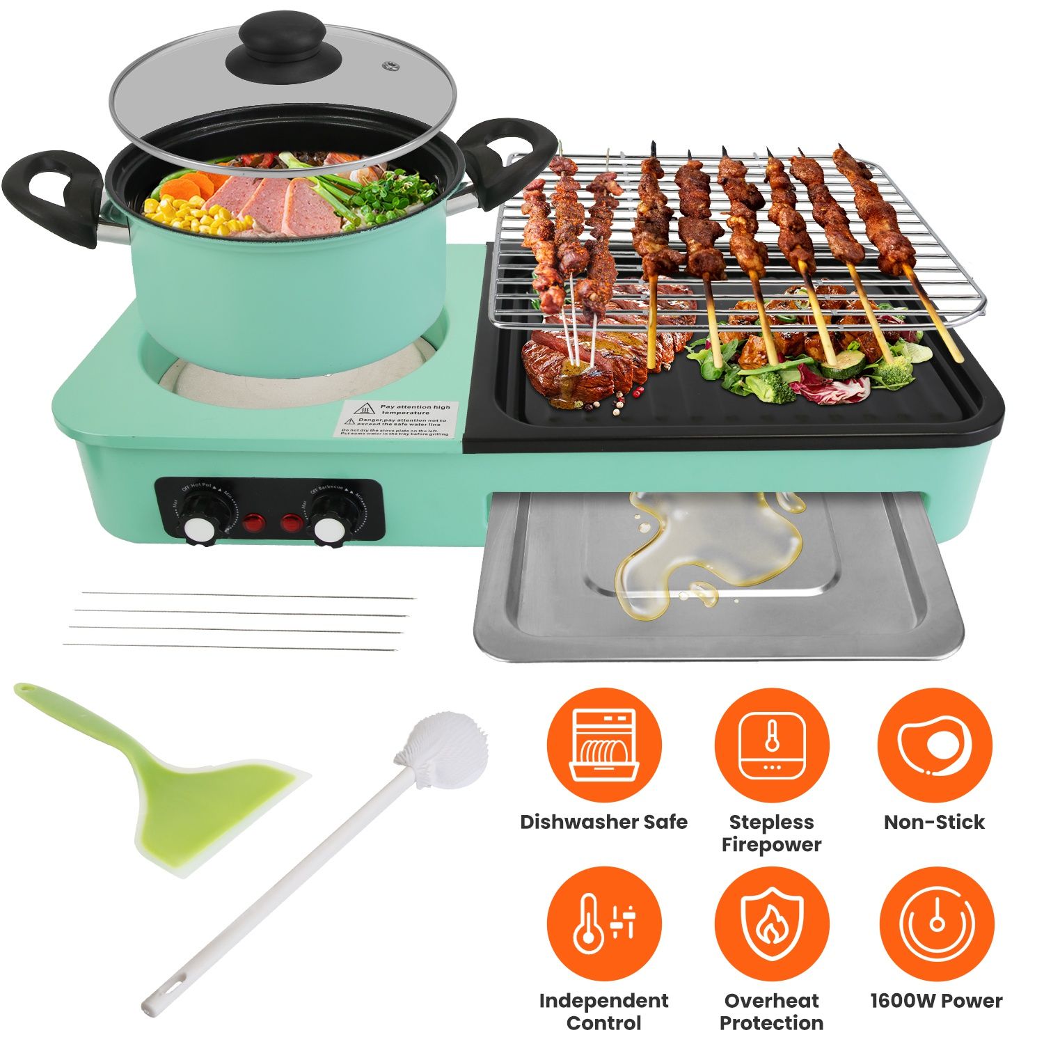 Rich Accessories For Easy Cleaning: Hot pot and grill pan can be separated from the electric body, innovative detachable design makes cleaning easier, dishwasher safe. We also provide cleaning brush and silicone spatula to clean the heating tube.