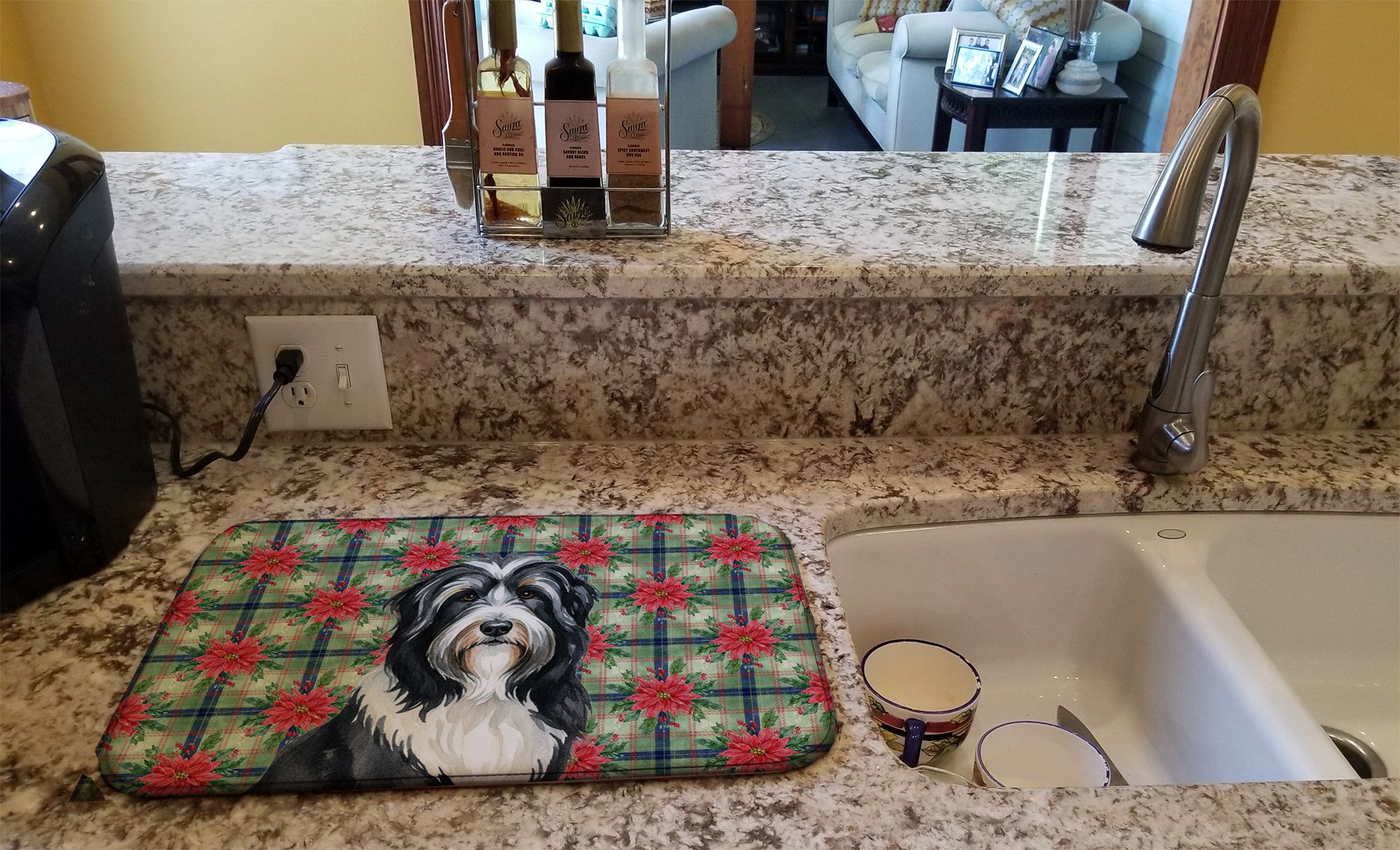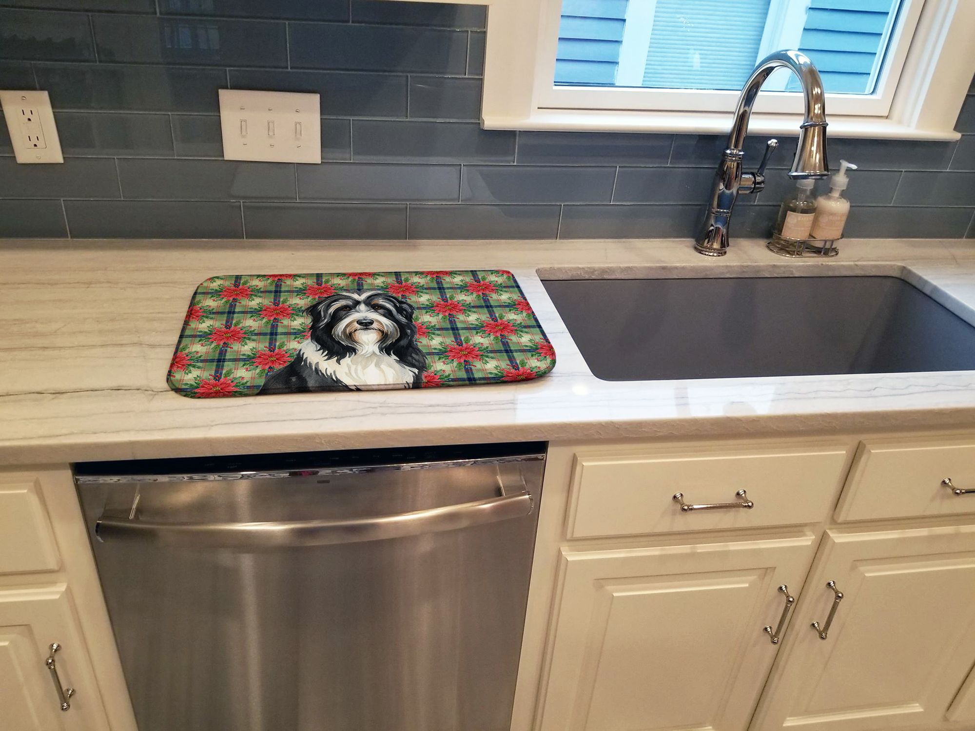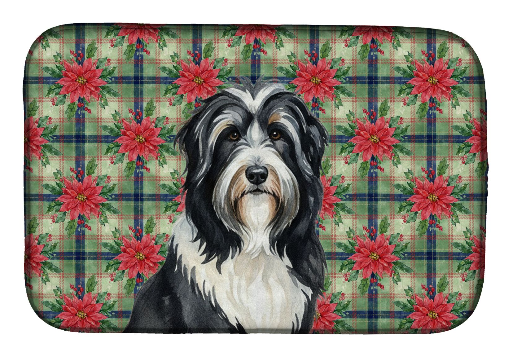 Dish Drying Mat featuring breed specific Bearded Collie artwork. Celebrate Christmas with this Christmas Dish Drying Mat. Say goodbye to messy countertops and soggy dish towels with our innovative dish drying mat. Our high-quality dish drying pad is designed to keep your countertops dry while offering a stylish and efficient solution. Whether you're air drying dishes, glasses, stemware, silverware, pots, pans, bottles, or even fruits and vegetables, our dish mat is the perfect choice. The 14 inches x 22 inches size fits most counters and dish drying racks, and the non-slip design ensures stability. Made with water-absorbent polyester and a polyurethane foam insert, our dish drying mat is not only functional but also durable. It's machine washable and printed in the USA for long-lasting use. The beautiful artwork adds flair to your kitchen decor, making it a perfect housewarming gift or present for any occasion. Upgrade your kitchen experience with our absorbent and versatile dish drying mat.