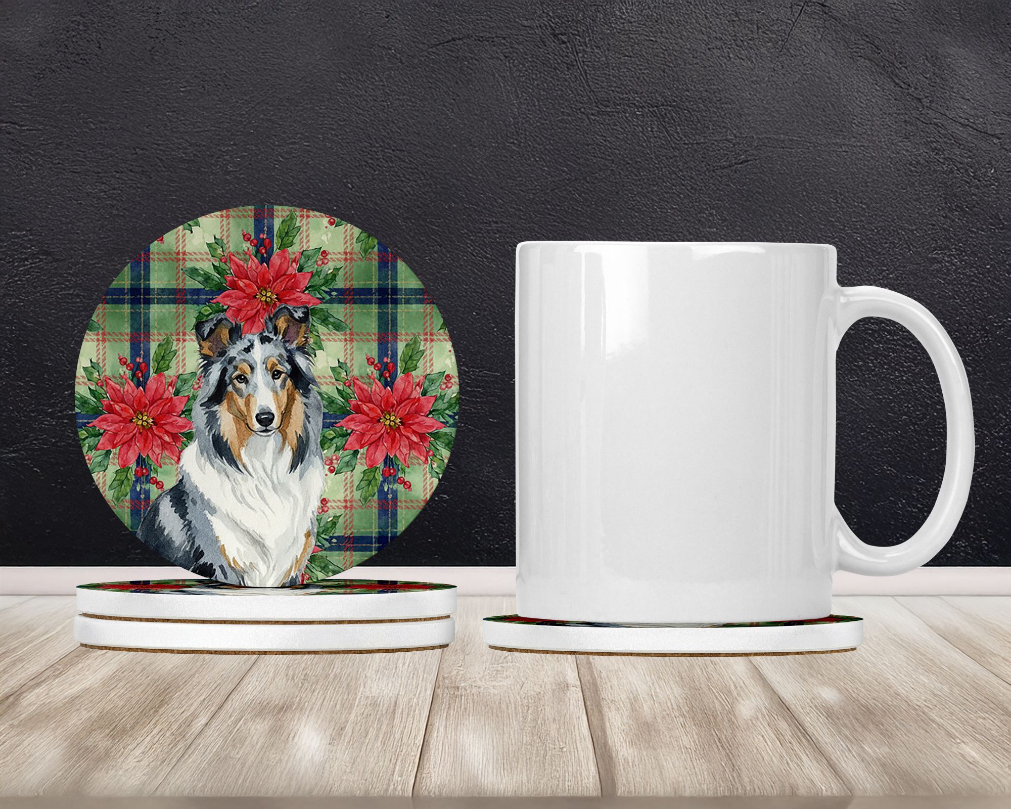 Blue Merle Collie Christmas PoinsettIas Large Sandstone Coasters Pack of 4 Absorbent Round Coasters Decor Gifts for Men or Women, 4 in, Multicolor